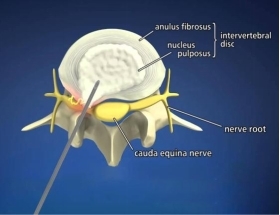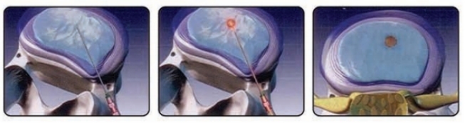 Process: A thin laser fiber is guided by X-ray (fluoroscopy/CT) into the affected disc.