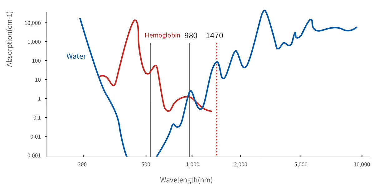 Optimal degree of water absorption in the tissue, emits energy at the wavelength of 1470nm. The wavelength has a high degree of water absorption in the tissue,and 980nm provides high absorption in hemoglobin. The bio-physical property of the wave used in the V6 laser means that the ablation zone is shallow and controlled, and therefore there is no risk of damage to adjacent tissues. Additionally, it has a very good effect on blood (no risk of bleeding).